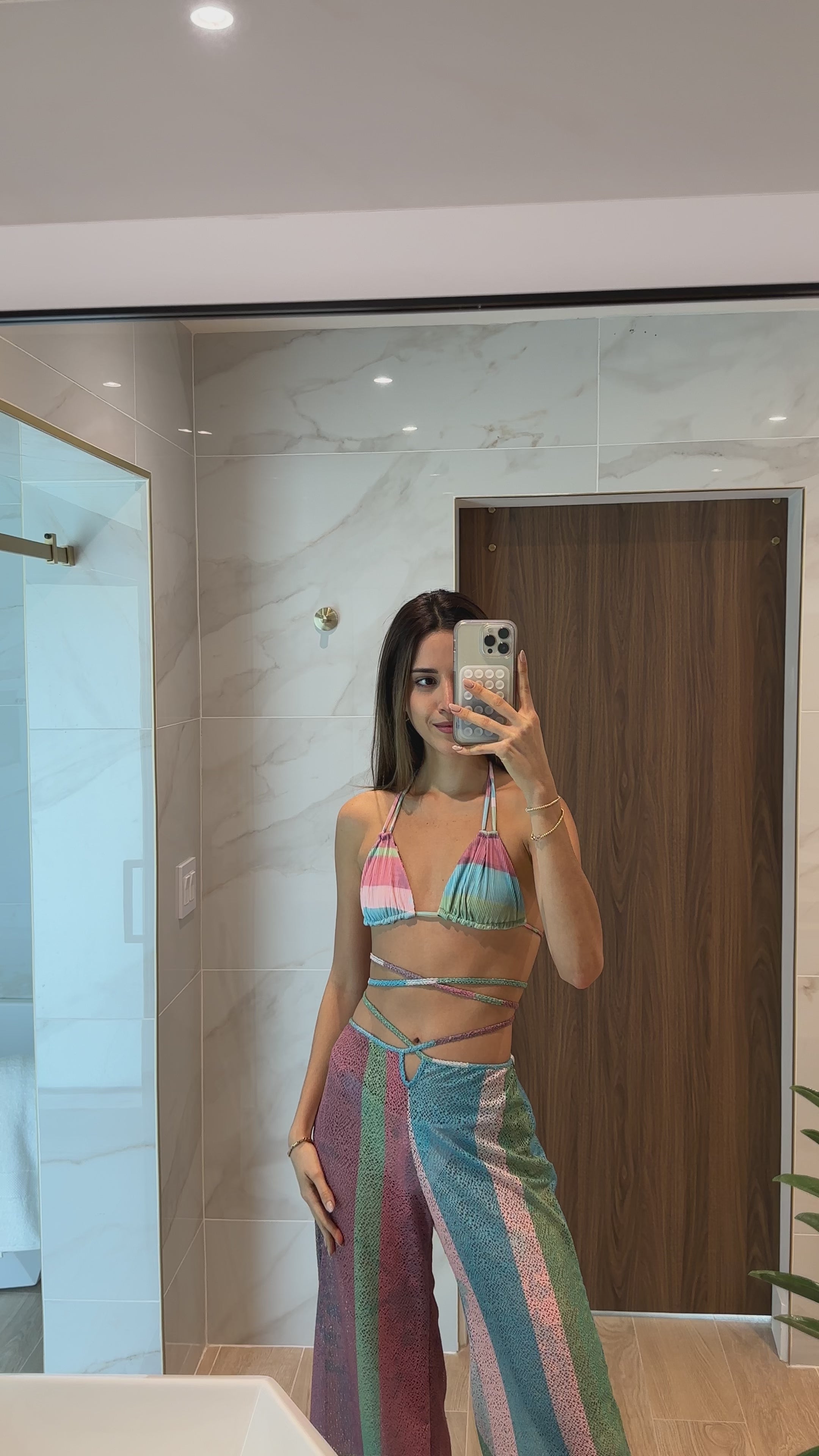 Pantalón en malla estampada. Bota recta. Tiras que cruzan en la cintura con una pequeña abertura en el delantero.